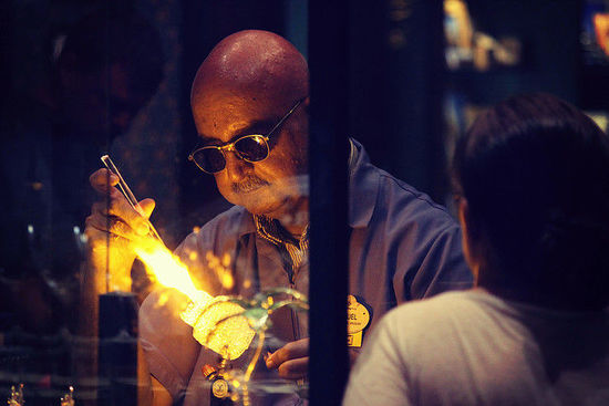 可能是因為長時間和迪士尼各種卡通人物打交道,米格爾本人的長相也有幾分卡通。不過,當他帶著特殊的墨鏡,“貓”在工作坊內進行玻璃創作時,神情里總透著一絲不茍?,F在,他仍然定期出現在會在美國迪斯尼樂園的玻璃門店中,隔著玻璃為游客進行高技派的玻璃工藝表演。爐火映紅的膚色,配合專注的神情,讓米格爾看起來儼然是一副“正在創作,請勿打擾”的肅穆藝術家范兒。