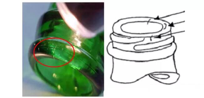 ② 瓶頸跟部裂紋:有時裂紋發生在瓶頸跟部;這種裂紋產生除了上述原因外,成型模的模底位置過高或過低同樣會導致瓶肩開裂,因為在開模時會使玻璃瓶拉向一側而撕裂。