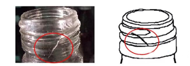 由于上述兩種原因(熱量散失快及機械力負荷)就會在瓶口面和瓶口與瓶頸連接處這兩個不同部位開裂,瓶口開裂是位于口部表面的垂直的、水平的或傾斜的裂紋。