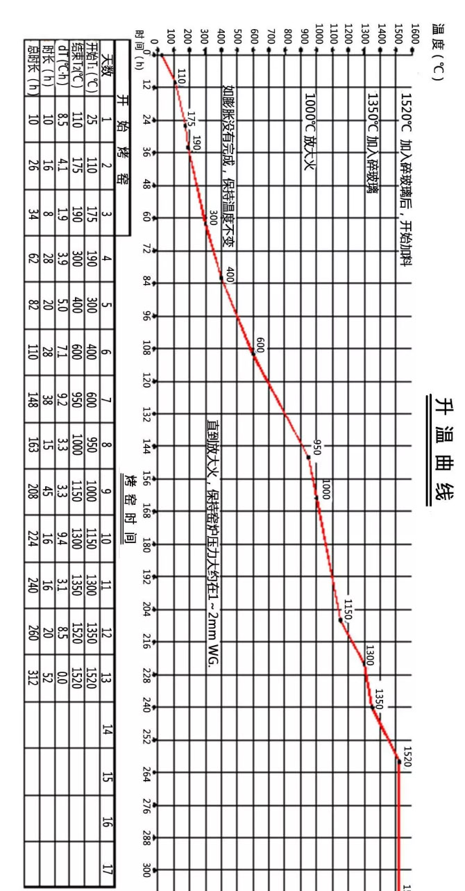 下面推薦國外某著名窯爐公司的烤窯升溫曲線表,它的長處是它不僅考慮了硅質(zhì)材料、33號電熔鋯剛玉磚的晶形轉(zhuǎn)化溫度,還考慮了41號電熔鋯剛玉磚的晶形轉(zhuǎn)化溫度,在1300~1350℃時,升溫速度為每小時3℃左右。我們通過實踐,若能嚴格按照該升溫曲線升溫,電熔鋯剛玉磚的炸裂會極大減輕,窯爐的烤窯質(zhì)量非常好。