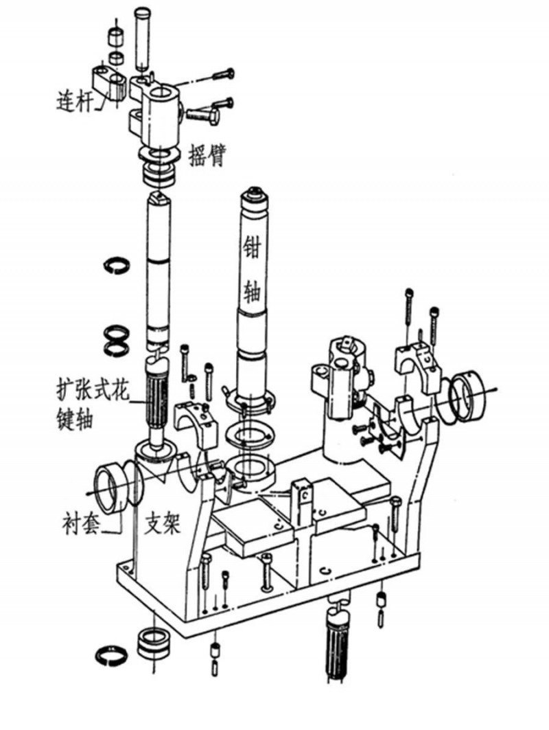 ⑴ 結構基本上與初型模抱鉗機構相似,主要由支架、抱鉗、定位心軸、聯桿、搖臂、花鍵軸等組成。整個機構也由六個螺絲固定在機組框架頂部。不同之處有:① 無助力氣缸;② 采用擴張式花鍵軸;③ 機構支架還支承口鉗機構。
