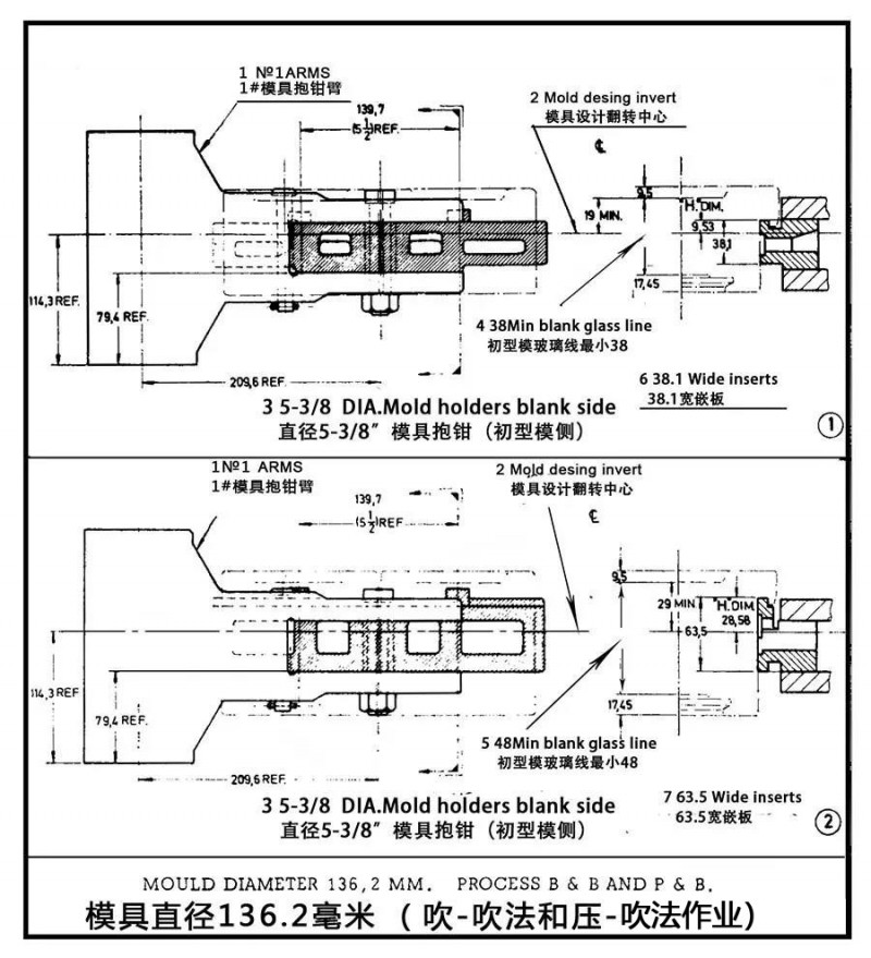 在安裝方式圖中,圓圈內的編號是用于5-1/2英寸中心距制瓶機模具的安裝件;方框內的編號是用于4-1/4英寸中心距制瓶機模具的安裝件。