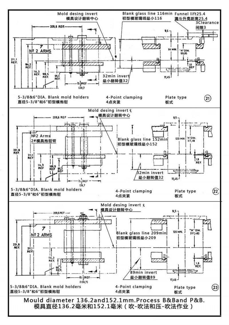 此制瓶機可以使用4-1/4英寸中心距的模具,但需配用相應的夾持板,圖13-10列出適用于4-1/4英寸中心距制瓶機的模子夾持板。