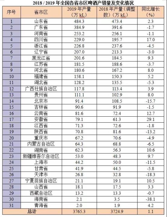2019年我國(guó)啤酒產(chǎn)量完成3765.3萬kL,比上年同期(調(diào)整數(shù)3724.9萬kL)增長(zhǎng)1.1%(如按當(dāng)年公布數(shù)3812.2萬kL計(jì)算為-1.2%),產(chǎn)量?jī)粼鲩L(zhǎng)40.4萬kL。人均占有量為26.9L,比上年下降0.4L。如以消費(fèi)量來計(jì)算,則2019年啤酒總消費(fèi)量為3796.3萬kL,比上年同期增長(zhǎng)0.8%,人均消費(fèi)量為27.1L,比上年上升0.4L。